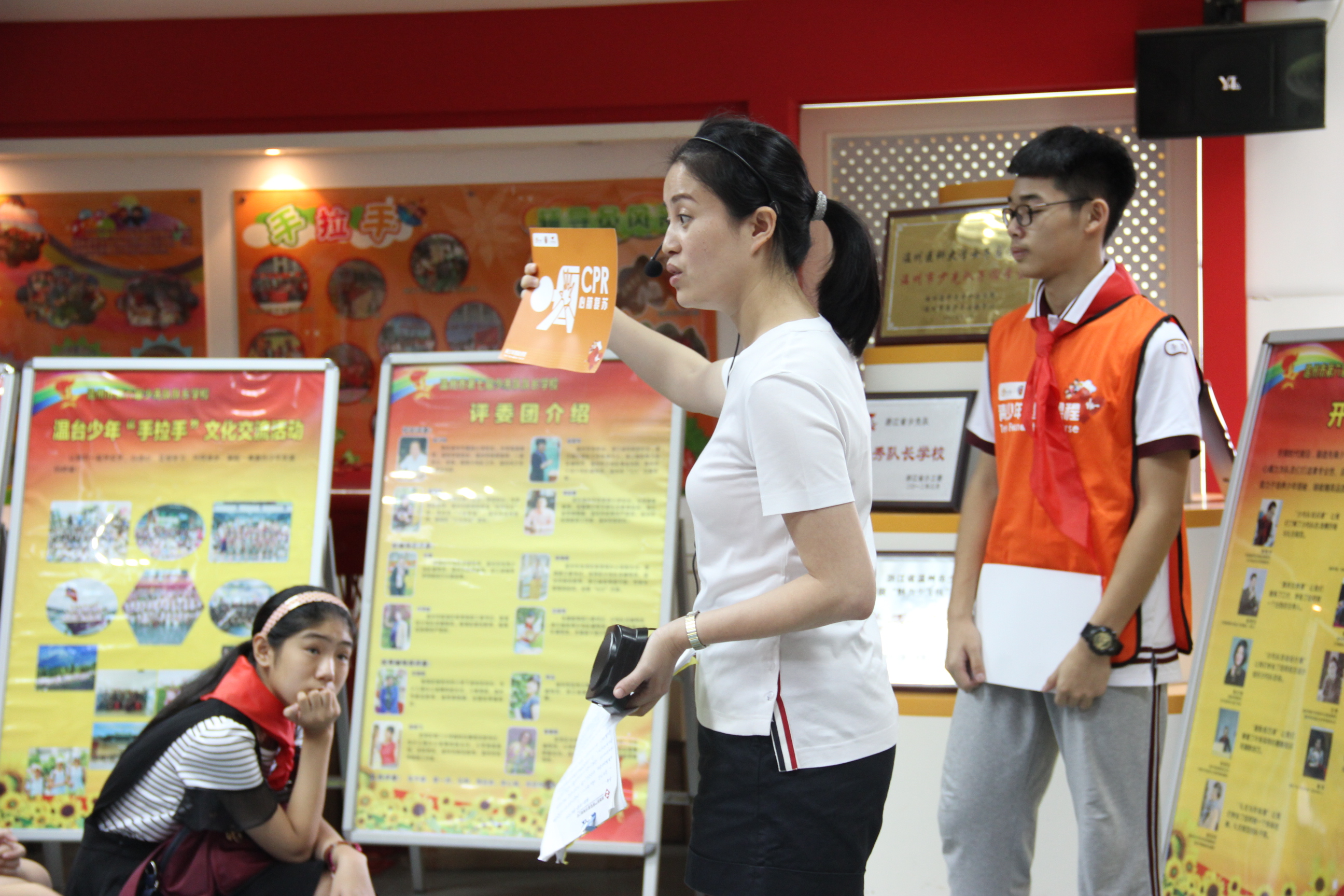8月19日,受温州新闻综合频道邀请,我校周鹏、李想、董想、潘加乐、王慧琳、胡宇航、叶开诚、胡迦密、路美玲、何培玮同学代表学校参加了由温州市少先队队长学校组织的“青少年基础急救课程”志愿者活动。这次活动主要由急救基本常识、“黄金60秒”救援、急救基本设施的使用规范、请求救护人员援助的注意事项等几个板块组成。