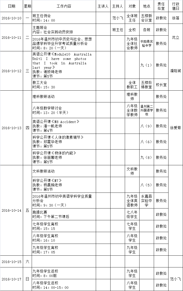 2016学年第一学期第7周工作行事历