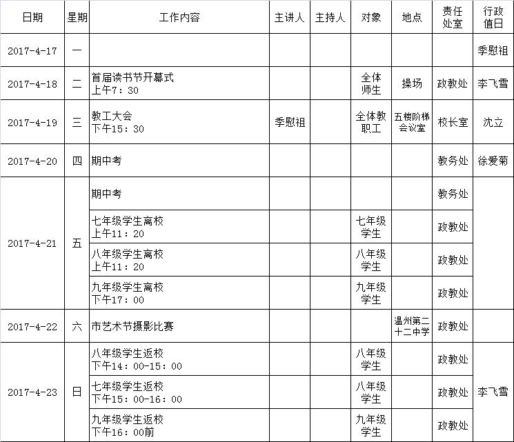 2016学年第二学期第10周工作行事历