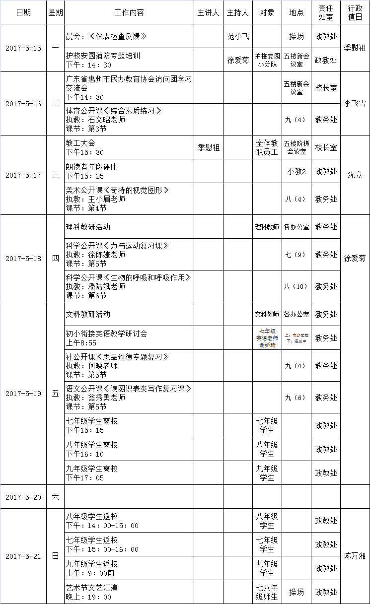 2016学年第二学期第14周工作行事历