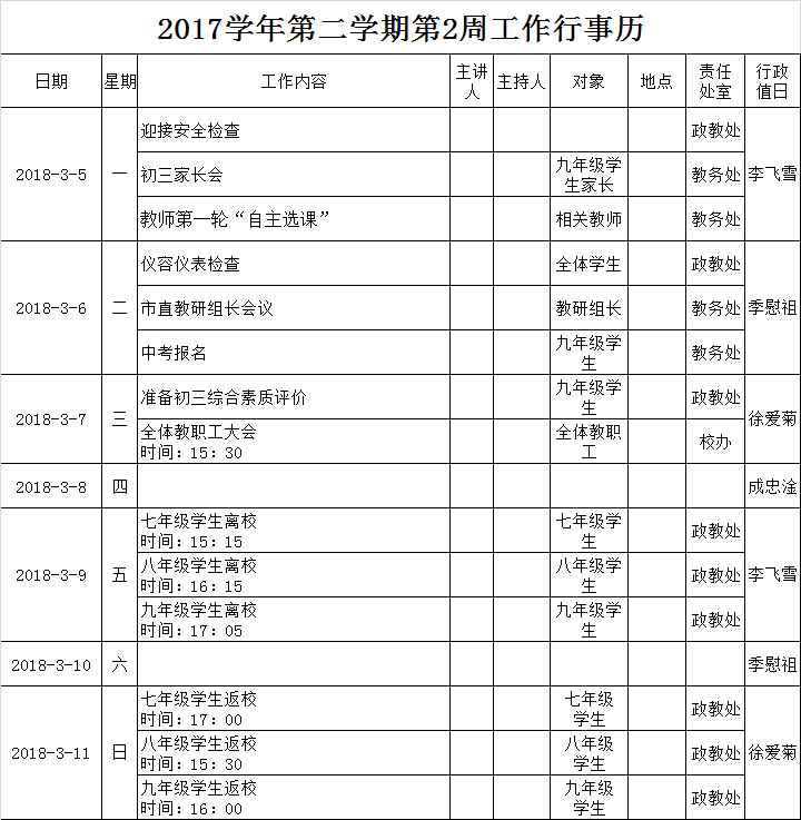 2017学年第二学期第2周工作行事历