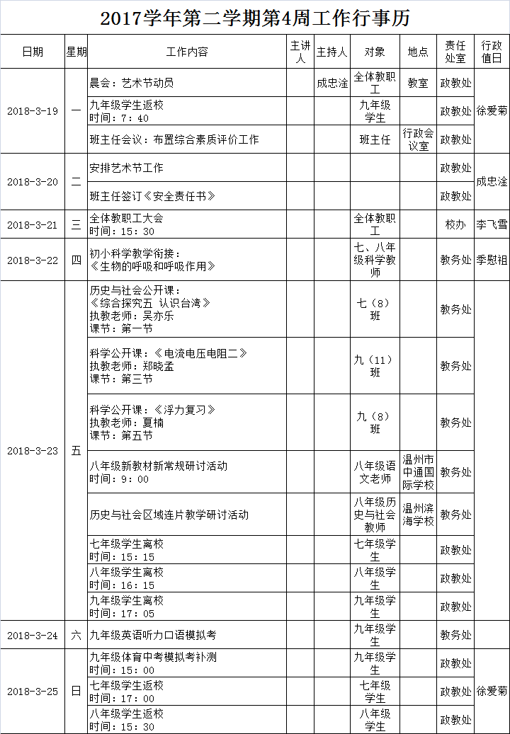 2017学年第二学期第4周工作行事历