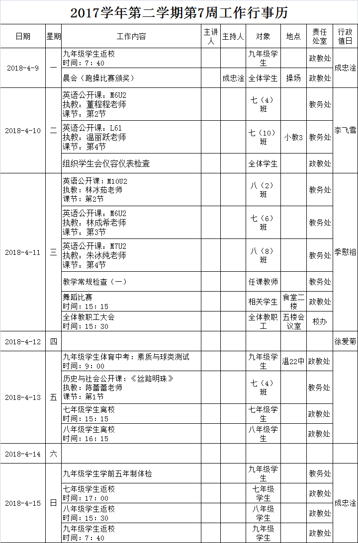 2017学年第二学期第7周工作行事历