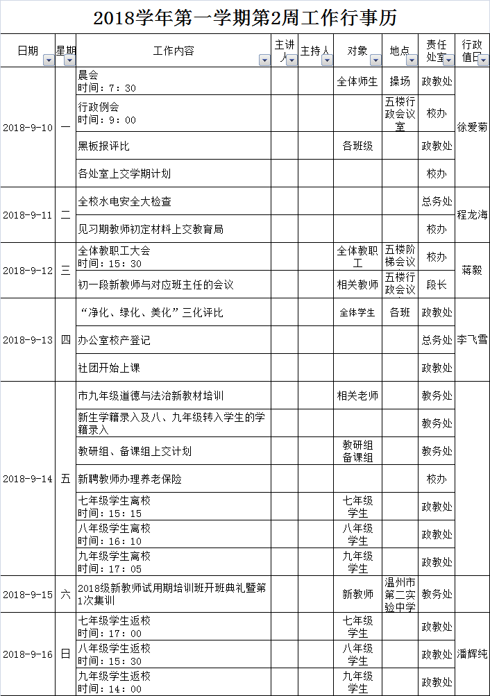 2018学年第一学期第2周工作行事历