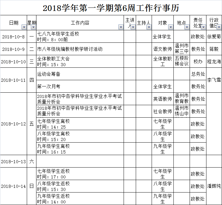 2018学年第一学期第6周工作行事历