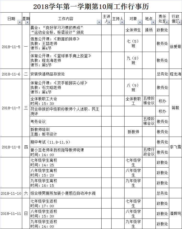 2018学年第一学期第10周工作行事历