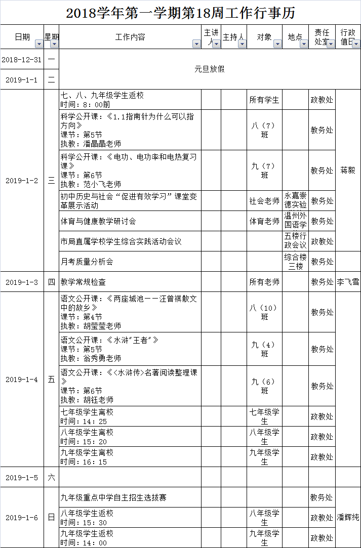2018学年第一学期第18周工作行事历