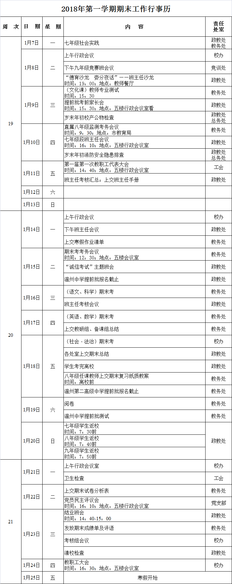 2018学年第一学期期末工作行事历