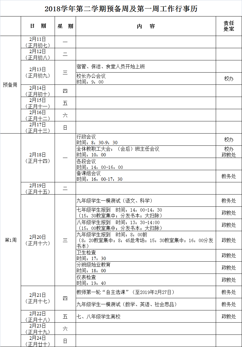 2018学年第二学期第预备周及第一周工作行事历
