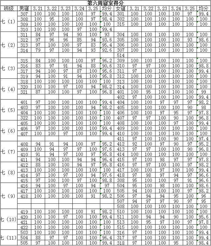 2015学年第二学期七年级第六周寝室得分公布