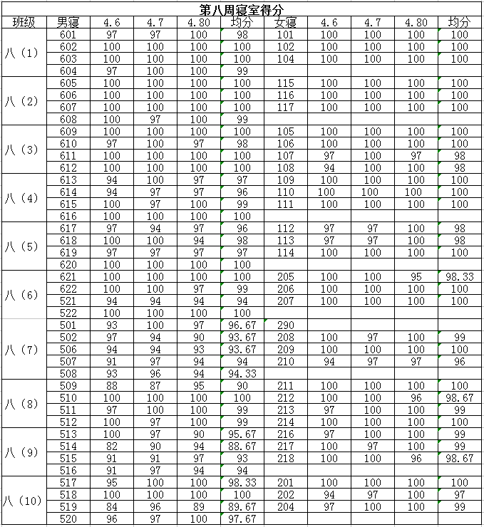 2015学年第二学期八年级第八周寝室得分公布