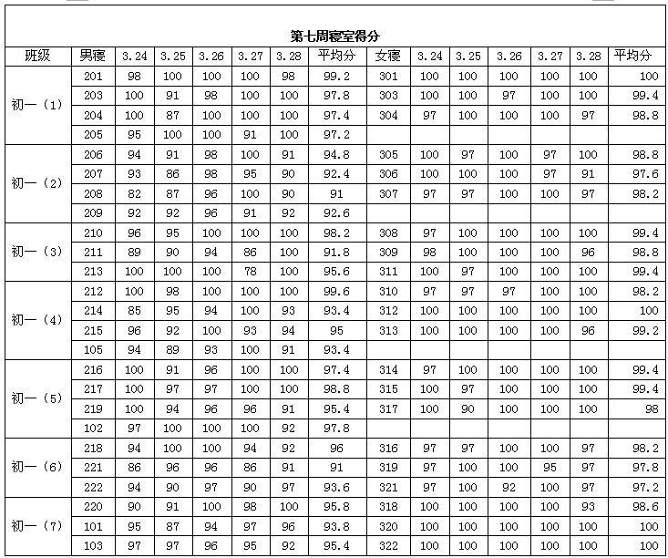 2013学年第二学期第七周寝室得分公布