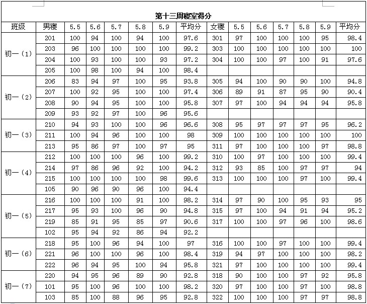 2013学年第二学期第十三周寝室得分公布