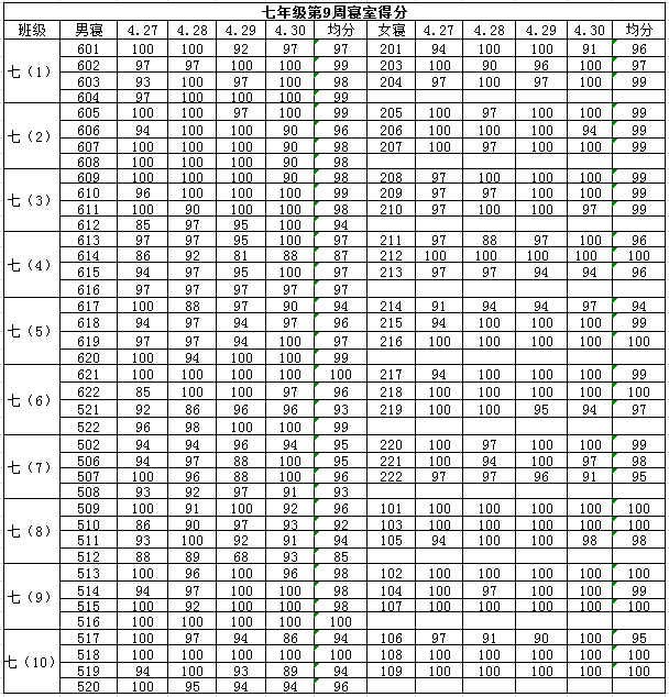 2014学年第二学期七年级第九周寝室得分公布