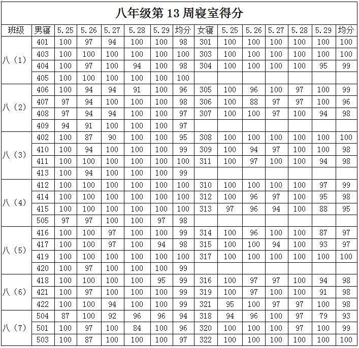 2014学年第二学期八年级第十三周寝室得分公布