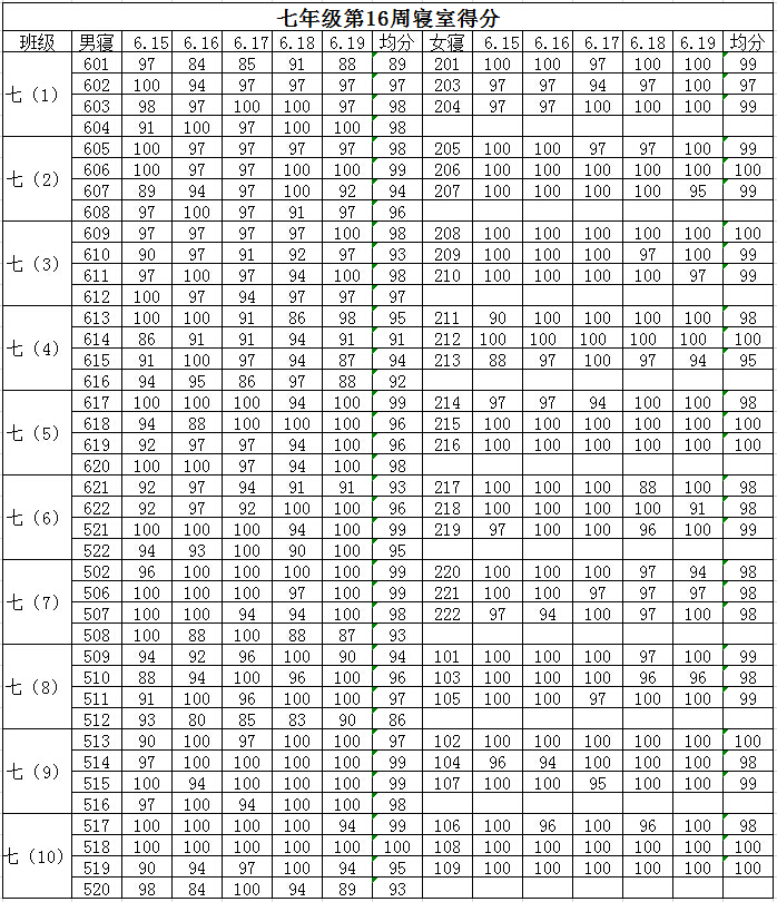 2014学年第二学期七年级第十六周寝室得分公布