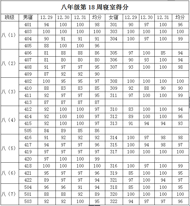 2014学年第一学期八年级第十八周寝室得分公布