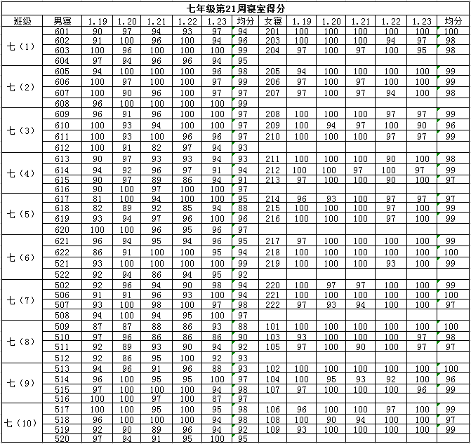 2014学年第一学期七年级第二十一周寝室得分公布