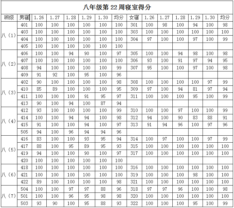 2014学年第一学期八年级第二十二周寝室得分公布