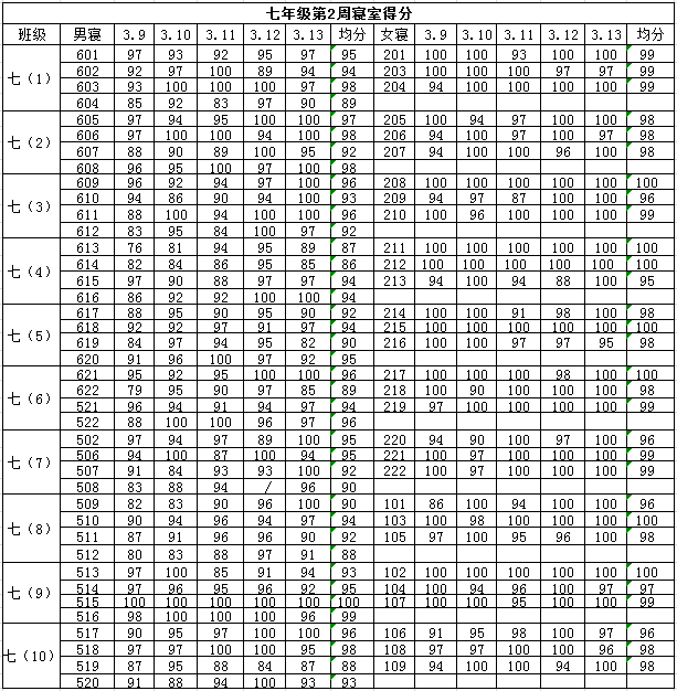 2014学年第二学期七年级第二周寝室得分公布