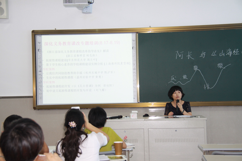 学科教学展示结束后,温州市绣山中学的余晓琴老师开展了精彩的专题讲座——《这是一个变化的世界——深化义务教育课程改革培训会的学习分享》。余晓琴老师总结了深化义务教育课改专题培训(8.17-8.19)的学习经验,提出了自己对于拓展性课程的理解。越秀文学社“职业体验”为核心的拓展性课程,“母语的表达”微型拓展性课程......余晓琴老师的讲座深入浅出,引人入胜,列举了很多教学实例,并谈了自己对于拓展性课程的思考。
